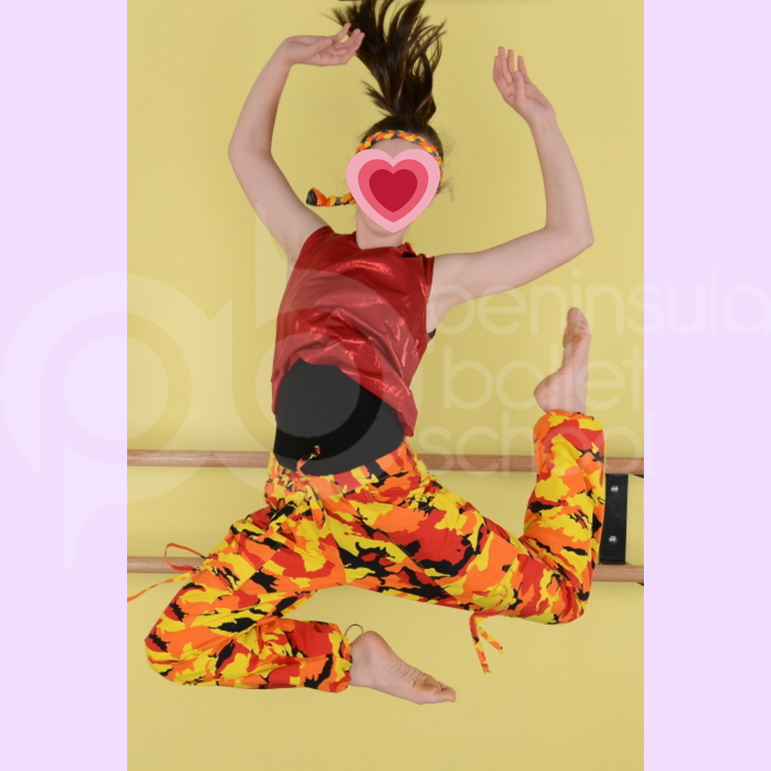 Lightweight yellow, red, orange and black camo print hip hop pants with elastic ankle.