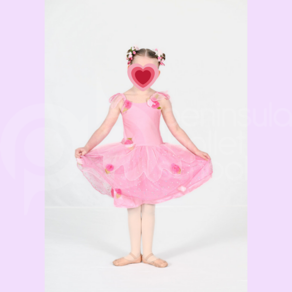 Pink princess dress with shoulder ruff and dark pink roses.